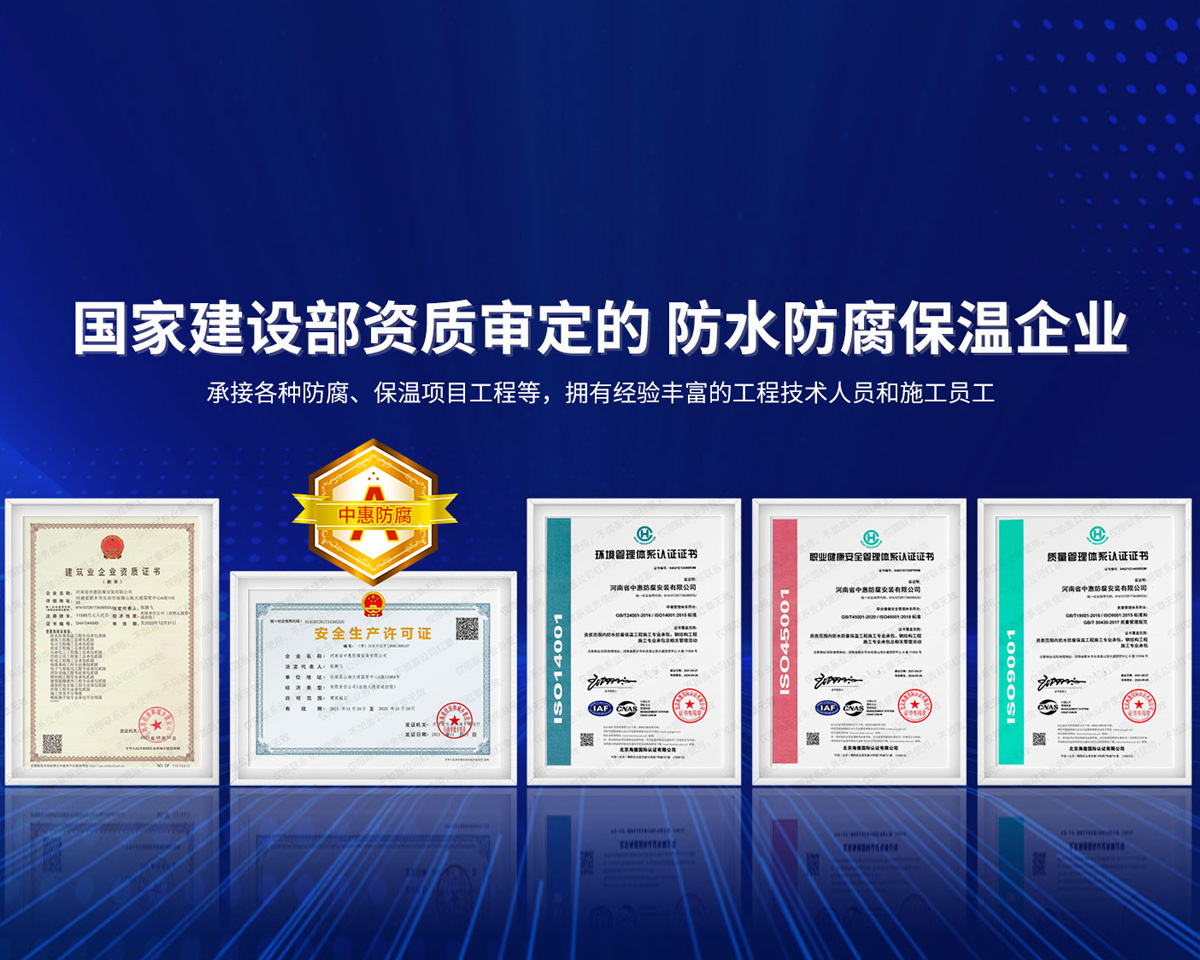 公司經營范圍:防水防腐保溫工程;消防設施工程;建筑裝修裝飾工程;建筑機電安裝工程;電力工程;建筑工程;石油化工工程;工業清洗工程;油罐清洗工程;鋼結構工程;環保工程;模板腳手架工程;電纜防火封堵、防污閃噴涂、外墻外保溫工程;各類施工勞務作業;設備維修、船舶鉚焊、涂裝;電力工程材料、建材、防水材料、防火材料、防腐保溫材料銷售,并相繼通過了GB/T19001-2008idtISO9001:2008GB/T50430-2007質量管理體系認證證書。GB/T24001-2004idtISO14001:2004環境管理體系認證證書。GB/T28001-2011idtOHSAS18001:2007職業健康安全管理體系認證證書。公司是中國防腐蝕于防護協會、中國施工企業管理協會、電力協會和中國鋼結構防水協會會員單位。 公司的經營業務涵蓋了石油、化工、電力、冶金、煤炭、船舶、國防、燃氣、水利、環保、交通運輸、航空及國防軍工和輕紡市政等行業的防腐保溫絕熱設備。鋼結構安裝、防火、防水、金屬噴鍍、聚脲噴繪、陰極保護、防滲透堵漏、玻璃鋼及各種磚版材料襯里、橡膠襯里、煙氣硫和耐酸溶劑腐蝕等工程施工。公司連續十年榮獲“省市先進施工企業”“安全生產先進單位”“重合同,守信用企業”和“AA***資質企業”的稱號。2000年被命名為市級文明單位,2002年被國家工商行政管理局命名為“重合同,守信用的企業”、被中國工業防腐蝕技術協會命名為“防腐蝕企業,能源節約及環境保護領域有豐富的經驗和***的業績。工程一次交驗合格率100%。其中攀枝花鋼鐵公司煉鐵廠四號高爐及熱風爐防腐工程、上海寶鋼公司煤氣柜防腐工程、撫順石油一廠裝置防腐項目、齊魯石化公司稀烴廠高塔防腐工程、吉林化學工業公司煉油廠油罐防腐工程、天津石化熱電廠六號爐頂棚聯絡管保溫工程、大慶油田(太倉)力神泵業工程、中國化學工程第十一建設工程、中原油田勘探局工程、中國石化銷售有限公司華北分部、魯皖輸油管道工程、貴州開磷息烽合成氨工程、陜西黃陵煤化工程、中國石油天然氣西部管道塔里木輸油工程、邯鋼集團邯寶鋼鐵公司煉鐵工程、德州供電工程、吉寶(南通)船廠工程,偃師華潤熱力工程、鄭州熱力總公司。 河南省中惠防腐安裝有限公司愿以豐富的施工經驗,***的技術,***的設備,***的管理,***的服務,竭誠為國內外廣大的用戶提供***滿意、******的工程作品。 我公司愿與國內外同仁一道,團結協作,共同推進防腐蝕行業發展! 公司地址:河南省長垣縣建設路北段360號 固定電話:0373-8866488 郵編:453400 網址:http://www_zhff_com_cn.opal-expo.com